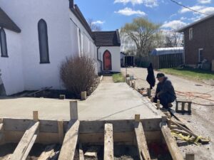 St. Luke’s is an older church, constructed in 1885. At that time, accessibility was not a design or construction consideration. This is shown in the picture of the way the front of the church used to be, with its original three concrete steps. Although three steps don’t sound like a lot, to a person with mobility restrictions, it might as well have been a mountain. For years, members, as they aged and developed problems, struggled to attend the small church that they loved so much. When Bishop Susan Bell, bishop of the Diocese of Niagara, introduced her new focus to the churches by way of The MAP Process, the parishioners of St. Luke’s took this as the impetus they needed to create change.