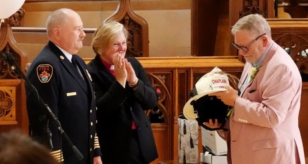 Peter is recognized by the Hamilton Fire Chief Dave Cunliffe (and will continue his ministry to them as Chaplain)